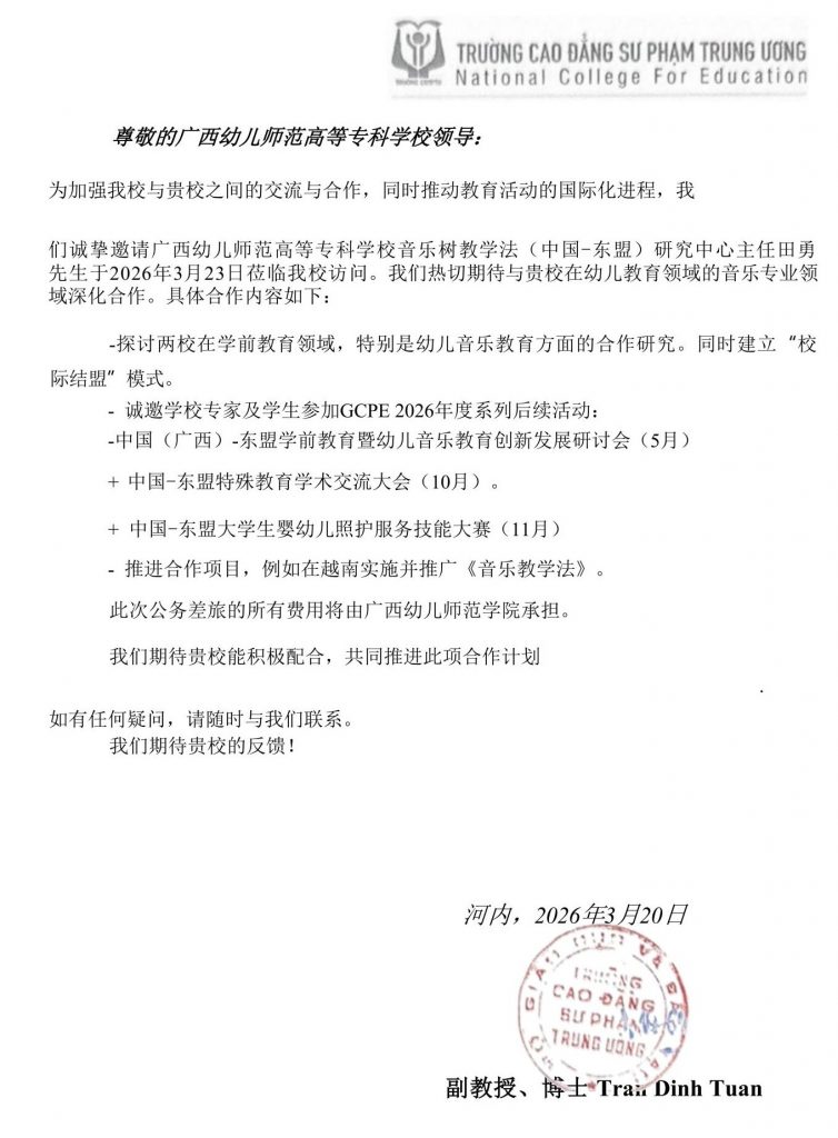 2026年3月23日,受越南中央师范学院(National College for Education, Vietnam)诚挚邀请 ,音乐树教学法(中国-东盟)研究中心主任田勇先生赴越南访问 。此次交流采取“线下访问+线上视频”的联动模式 ,广西幼儿师范高等专科学校(以下简称“广西幼师高专”)校领导及相关部门负责人通过视频会议方式全程参与,共同见证中越学前教育合作的新篇章 。